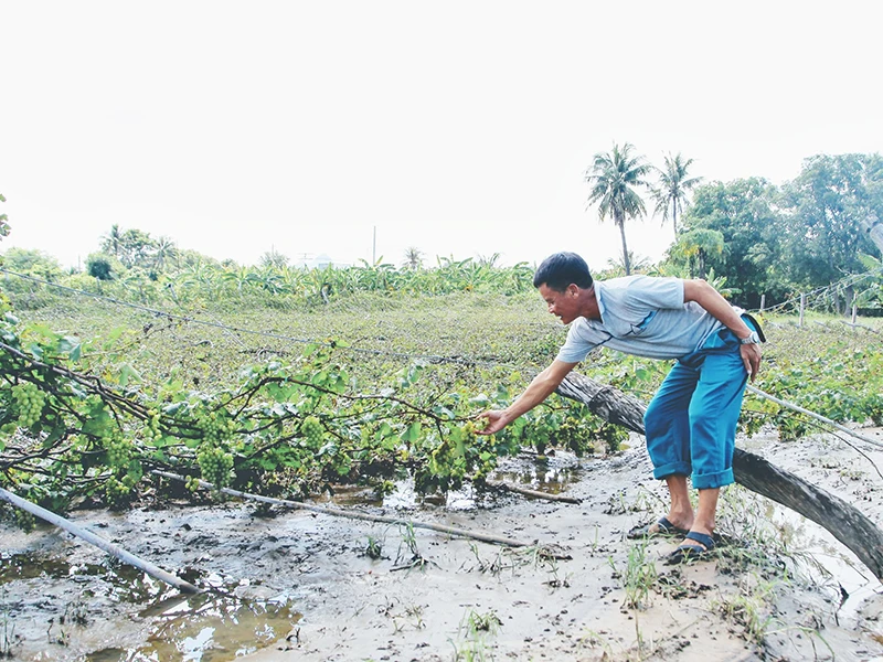 Anh Lê Văn Toàn tiếc đứt ruột 3.500 m2 nho đang vào vụ của anh bị mất trắng vì lũ. Ảnh: NINH SƠN