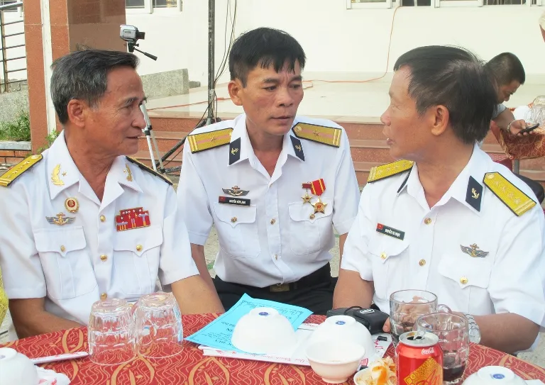 Những cựu chiến binh Trường Sa gặp nhau, từ trái qua Đại tá Lê Xuân Bạ, nguyên Phó Chủ nhiệm chính trị Vùng 4 Hải quân, nguyên Chủ tịch huyện đảo Trường Sa; Anh hùng Nguyễn Văn Lanh, Đại tá Nguyễn Bá Ngọc, nguyên Phó Tư lệnh Vùng 4 Hải quân. Ảnh: TẤN LỘC