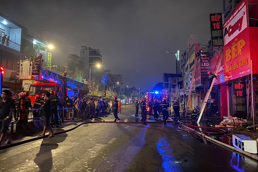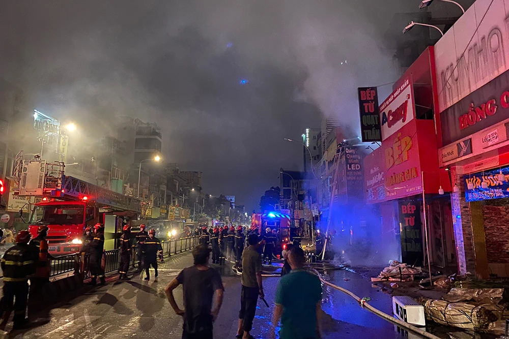 Cảnh sát PCCC sau đó điều động nhiều phương tiện cùng hàng chục cán bộ chiến sĩ đến hiện trường. Cảnh sát chia nhiều mũi, leo lên tầng cao và các căn nhà lân cận để khống chế đám cháy.