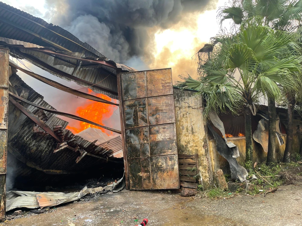 Ngọn lửa bao trùm khu nhà xưởng. Ảnh: H.DŨNG |