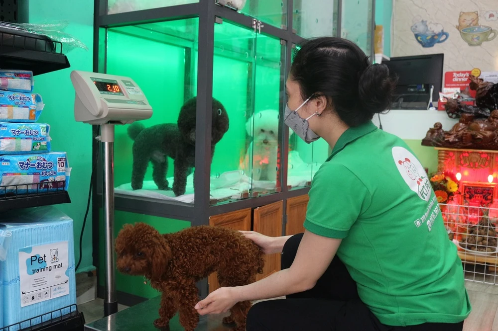 Thú cưng được kiểm tra cân nặng trước khi ở lại spa. Ảnh: KHÁNH CHI