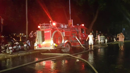22 giờ 30 ngày 10-7, hàng chục Cảnh sát Phòng cháy chữa cháy cùng 4 xe cứu hỏa vẫn đang hoạt động hết công suất để ngăn chặn đám cháy lan sang những nhà bên cạnh.
