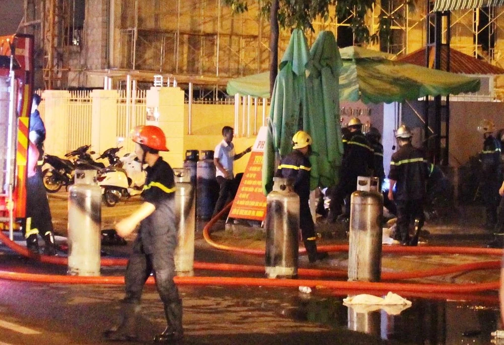 Đám cháy nhanh chóng bao trùm cả khu vực bếp, mùi khí ga nồng nặc, lan tỏa cả khu vực. Mọi người không đám tiếp cận ngọn lửa vì trong bếp vẫn còn nhiều bình ga lớn.