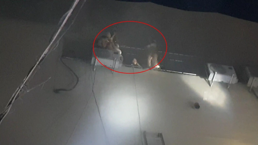 Người dân bị mắc kẹt trên nóc quán karaoke được lực lượng công an hỗ trợ đưa xuống an toàn, một số người khác do quá hoảng loạn đã nhảy từ trên cao xuống bị thương. Ảnh: LA |