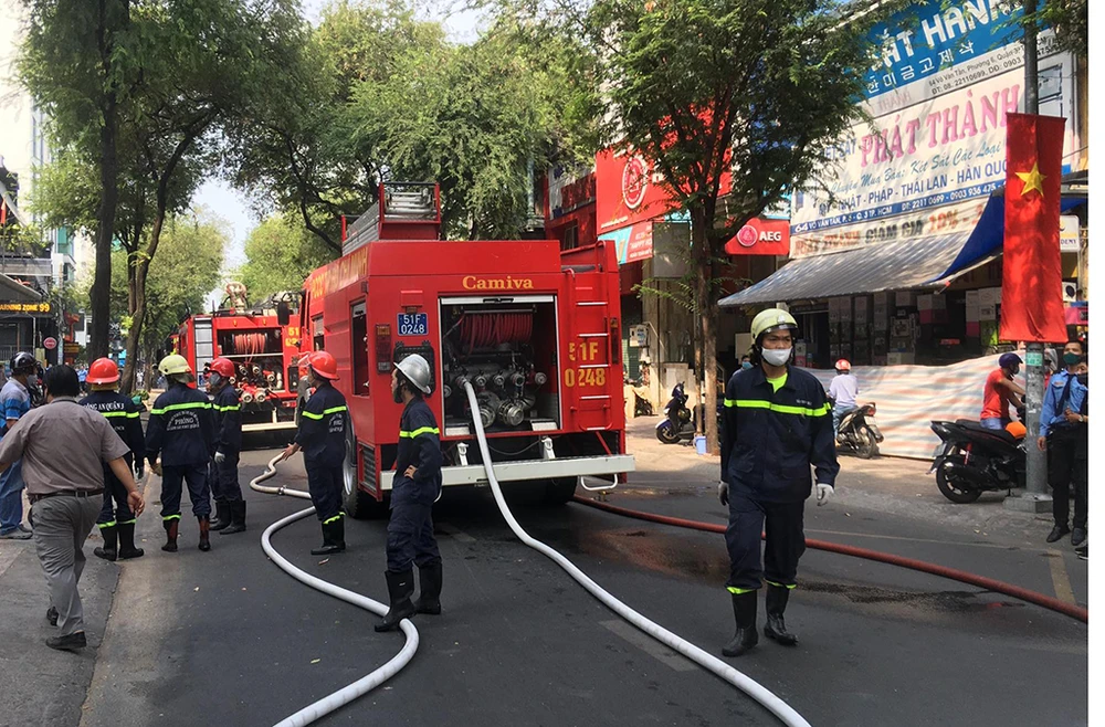 Nhận tin báo, cảnh sát PCCC quận 3 đã điều động nhiều xe chuyên dụng đến hiện trường dập lửa, các tuyến đường xung quanh khu vực cũng bị phong tỏa để đảm bảo an toàn.