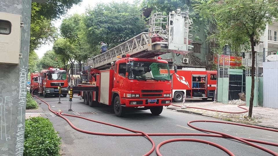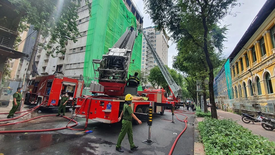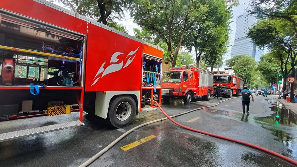 Nhận tin báo, Đội cảnh sát PCCC& CNCH Công an quận 1 điều bốn xe chữa cháy và hai xe thang đến hiện trường. Đến 14 giờ 20, hai xe thang vẫn đang tiếp cận tầng trên cùng của tòa nhà.