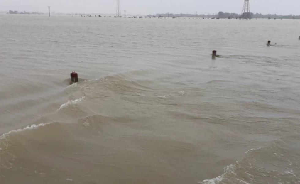 Nước lũ qua xã Cẩm Quan, huyện Cẩm Xuyên, Hà Tĩnh đang còn cao, chảy xiết.