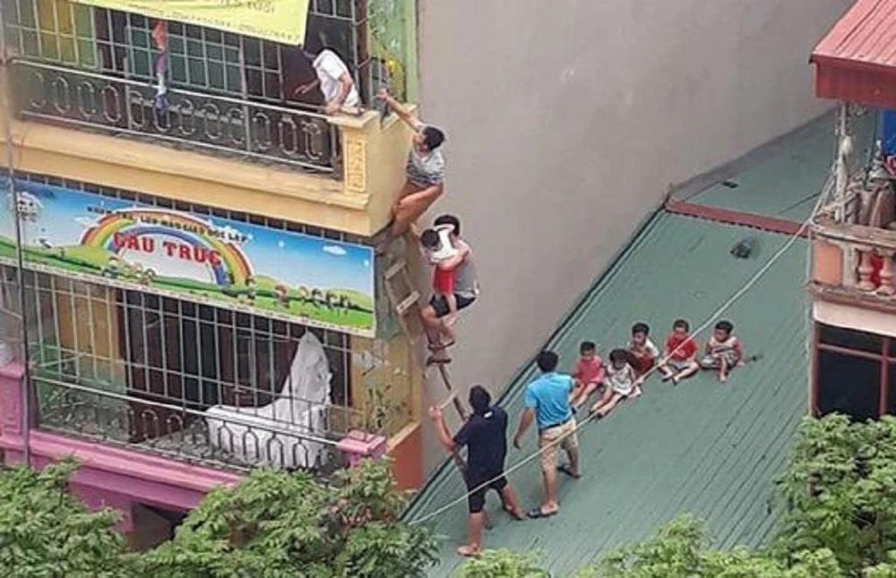 Cô trò của trường mầm non phải trèo qua mái tôn để thoát nạn. Ảnh: Facebook