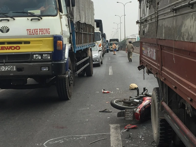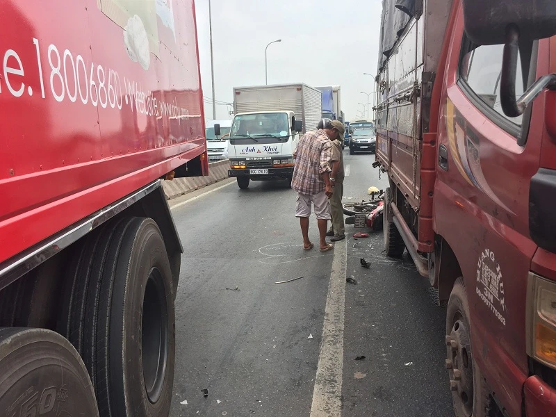 Tại hiện trường, chiếc xe máy bị kẹt giữa hai xe tải nằm ở làn đường dành cho ô tô, hư hỏng nặng, nhiều bộ phận vỡ nát văng khắp nơi.