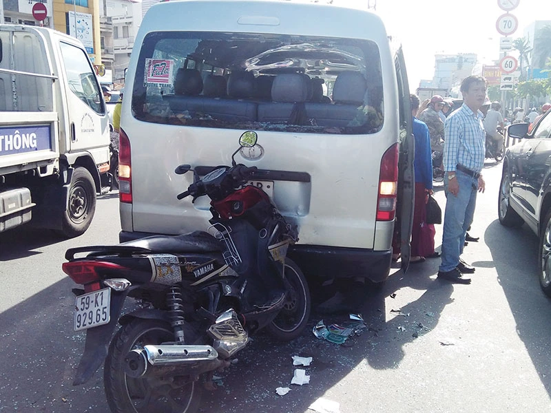 Khi đến giao lộ đường số 10 (quận 6, TP.HCM) thì tông thẳng vào đuôi xe khách 16 chỗ chạy cùng chiều phía trước.