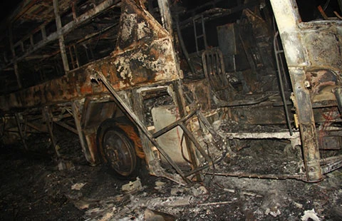 Chiếc xe khách bị cháy chỉ còn trơ lại bộ khung sắt. Ảnh: ĐD