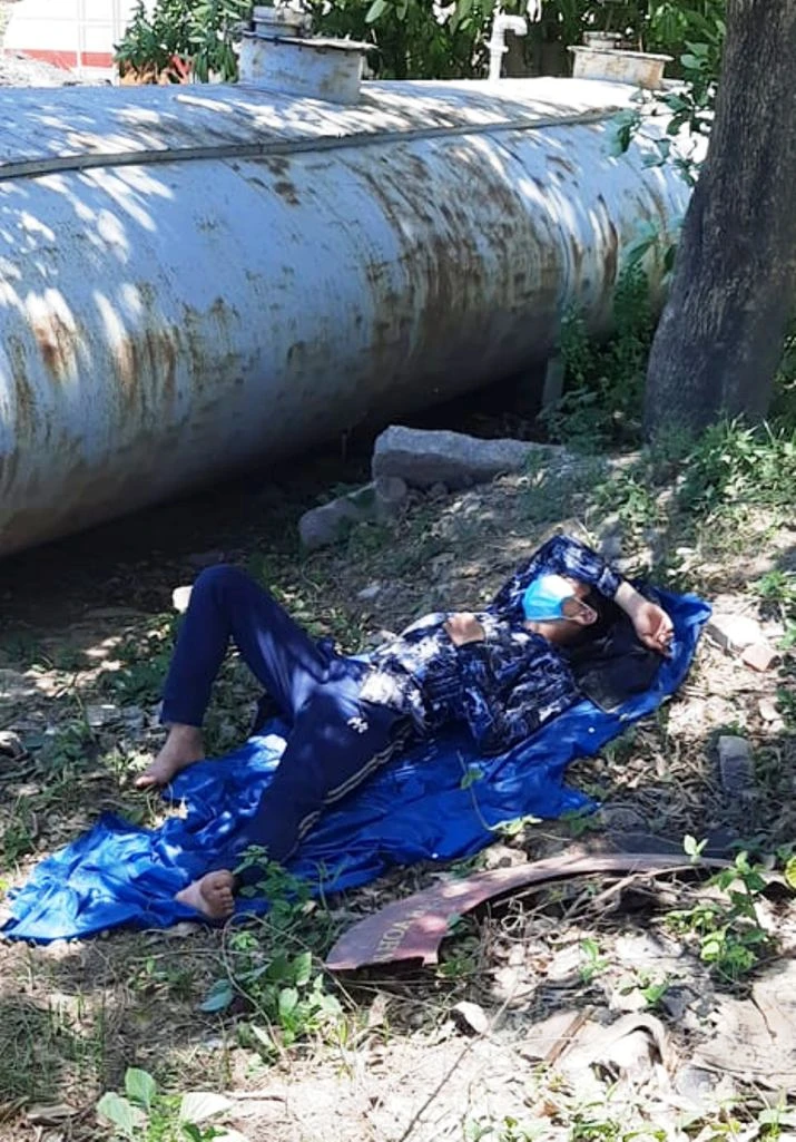 Sau nhiều ngày, đêm chạy xe máy từ Bình Dương về quê Nghệ An, anh Định đang "quên" vợ và hai con ở Huế, anh mệt mỏi đang nằm nghỉ gần cầu Bến Thủy 2. Ảnh: HL
