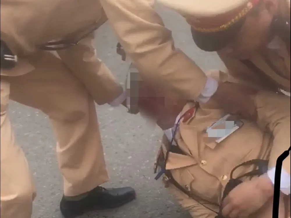 Cú tông mạnh khiến CSGT này bất tỉnh trên mặt đường. Ngay lập tức, cán bộ này được đưa đi cấp cứu, đôi nam nữ bị đưa về trụ sở công an để làm việc.