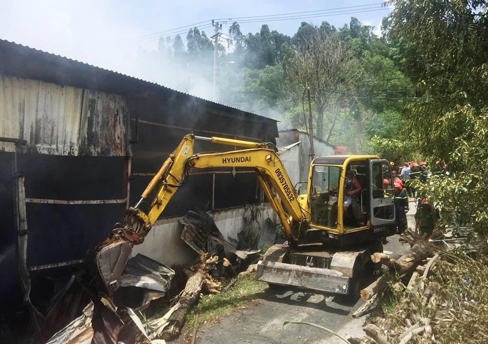 Một xe múc của người dân đã được điều đến hiện trường để cào các vật liệu ra ngoài, tạo điều kiện cho công tác chữa cháy dễ dàng hơn.