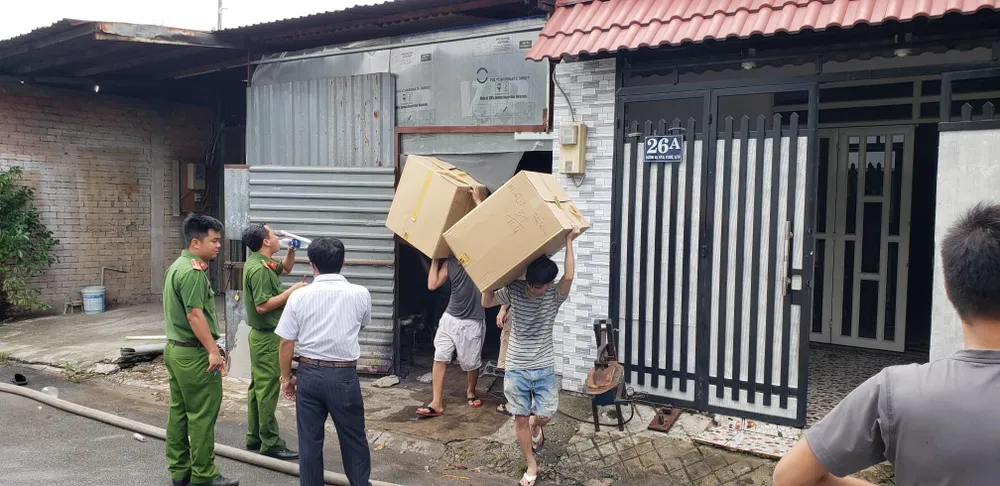 Lực lượng chức năng vừa dập lửa vừa hỗ trợ người dân di dời tài sản.