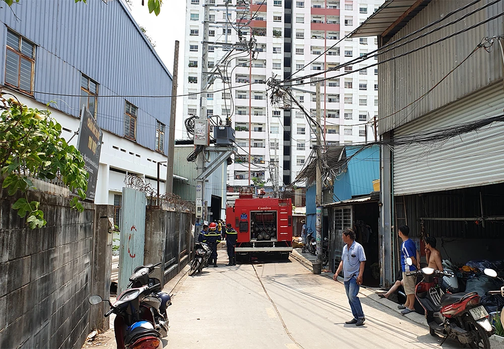 Cảnh sát PCCC quận 12 điều động năm xe cùng hàng chục cán bộ chiến sĩ nhanh chóng đến hiện trường khống chế đám cháy trong ít phút.