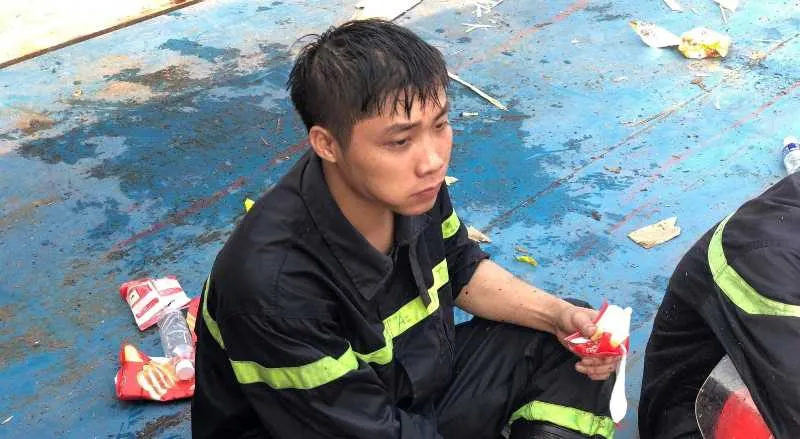 Sau khi dập tắt được vụ cháy lớn, cảnh sát PCCC ngồi nghỉ và ăn miếng bánh lót bụng cho đỡ đói.