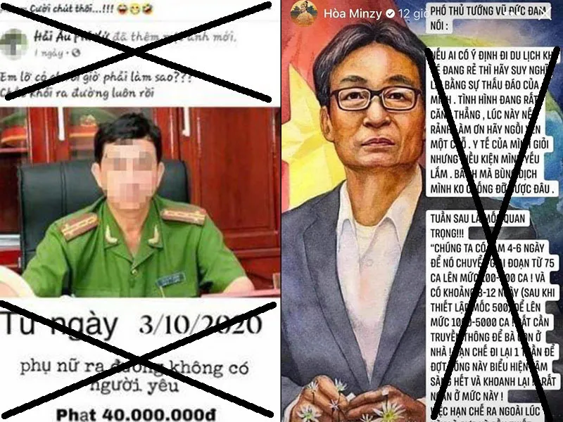 Ảnh 1: Tấm ảnh chế dễ gây hiểu lầm (người công an đã được chúng tôi che mặt). Ảnh: TRÚC PHƯƠNG. Ảnh 2: Ca sĩ Hòa Minzy đã bị phạt vì chia sẻ hình ảnh chân dung Phó Thủ tướng Vũ Đức Đam ghép với phát ngôn giả.