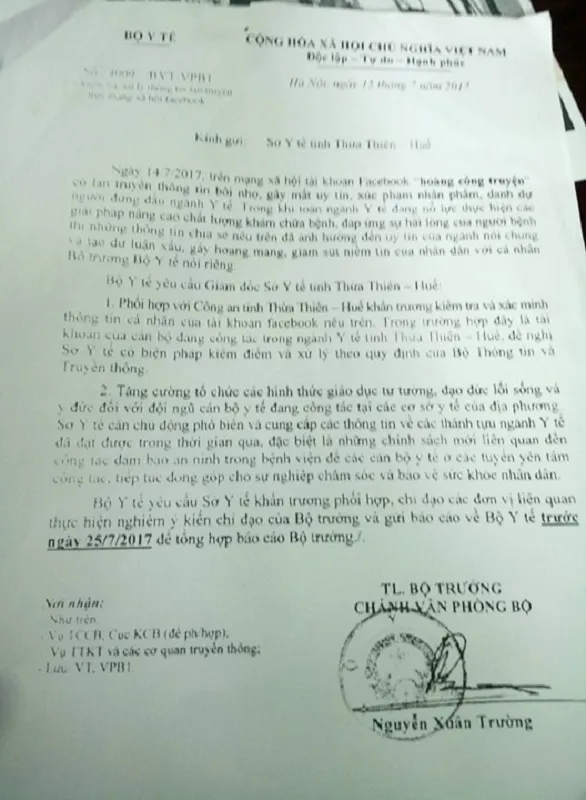 Theo đó, vào ngày 15-7, Bộ Y tế có công văn do ông Nguyễn Xuân Trường, Chánh Văn phòng Bộ Y tế, thừa lệnh Bộ trưởng ký gửi Sở Y tế tỉnh Thừa Thiên-Huế kèm với bản nội dung in từ Facebook có tên Hoàng Công Truyện.