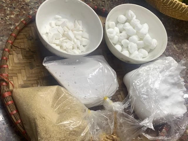 Sau đó thì cho bột vào bao vải để thải nước, chằn các vật nặng lên trên, những cục bột sau đó được chấn thành từng ký một đóng bao như cục gạch đem bỏ mối các chợ.