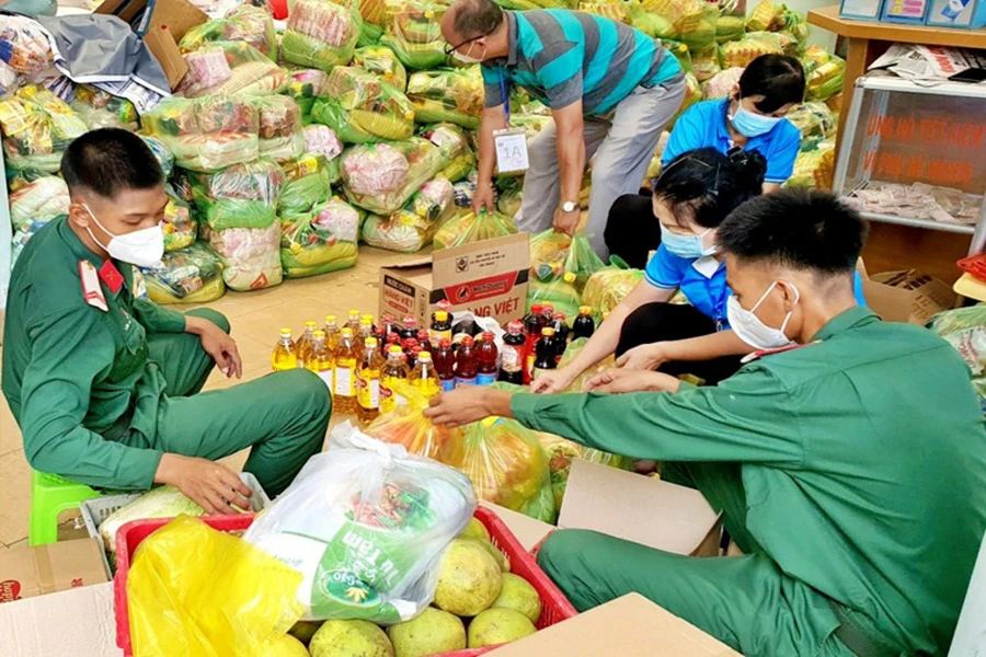 Các chiến sĩ quân đội đang tất bật chia quà cứu trợ cho người dân tại trụ sở UBND phường 3, quận Bình Thạnh. Ảnh: TM