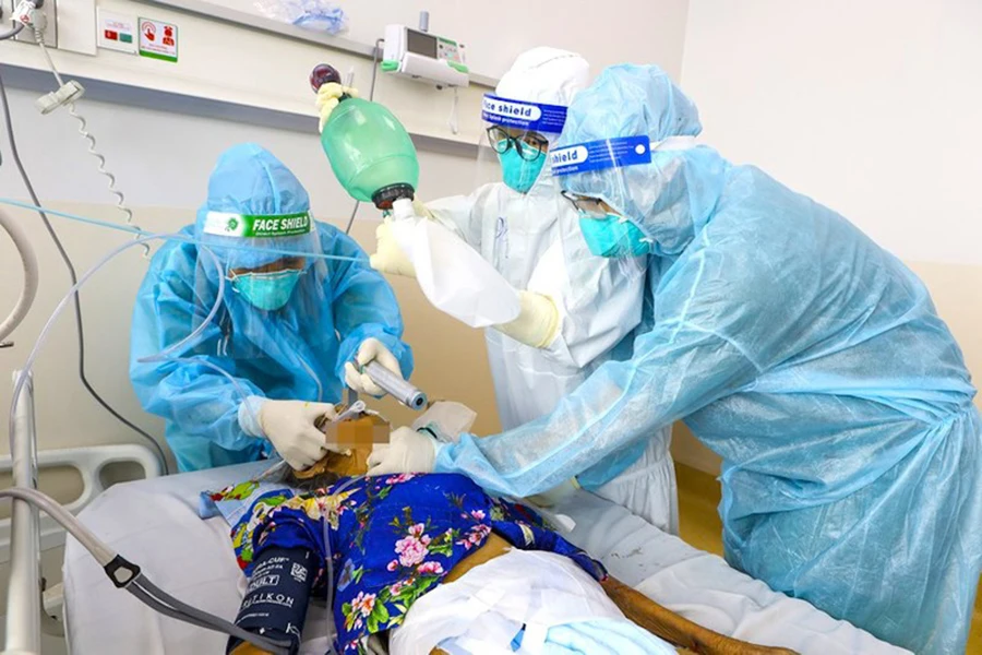 Các y bác sĩ BV Hồi sức COVID-19 TP.HCM đang đặt nội khí quản cho bệnh nhân mới đến, giúp duy trì đường thở thông thoáng. Ảnh: NGUYỆT NHI