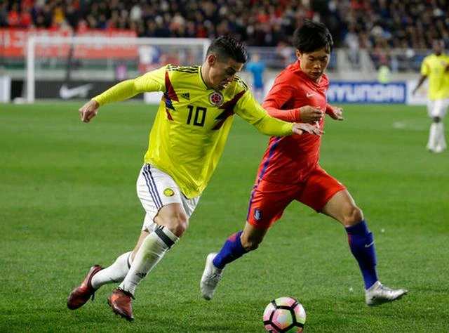 James Rodriguez (10, Colombia) nỗ lực đi bóng qua cầu thủ Hàn Quốc.