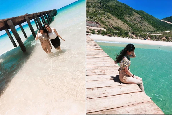 Hai màu nước biển: xanh ngọc và xanh lam phân chia tách biệt. Ấn tượng đầu tiên khi du lịch ở đảo Kỳ Co đó là đá ở khắp mọi nơi, nhô lên thành từng hàng ra biển, đá dựng đứng thành hang hốc, đá xếp dọc theo khe suối từ trên đỉnh núi xuống dưới, đẹp tuyệt trần. Ảnh: Nhi Nguyễn