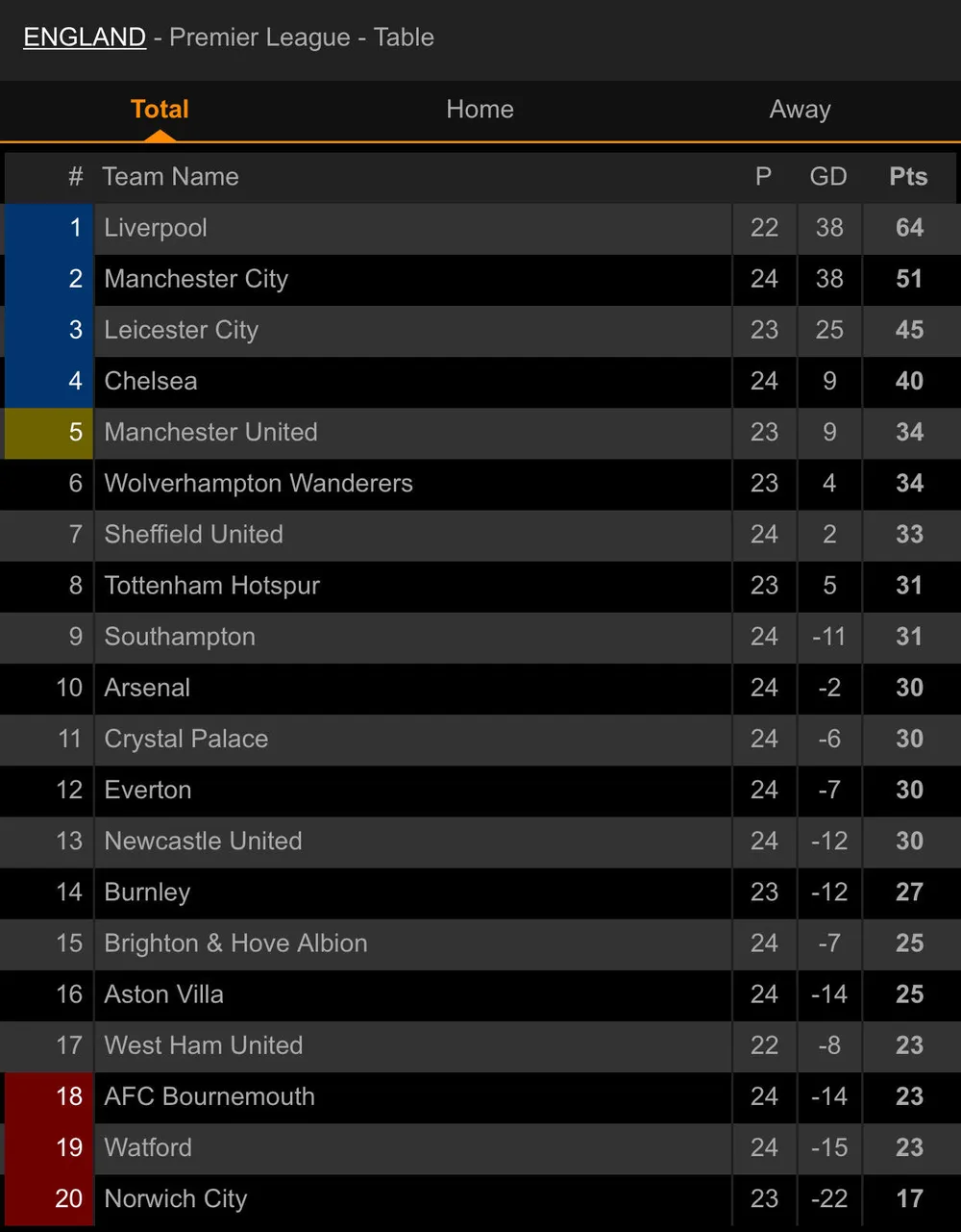 BXH Premier League: