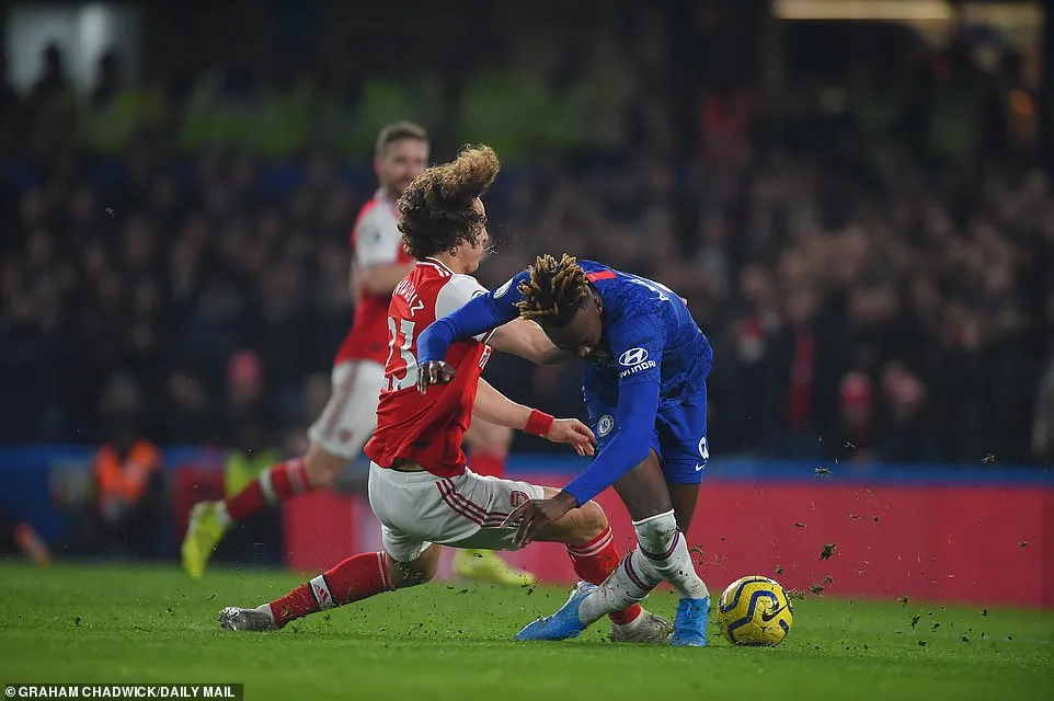 Tuy nhiên với hàng thủ thi đấu cẩu thả, Arsenal rơi vào thế mất người ở phút 26 từ tình huống trả bóng về cẩu thả của Mustafi, trung phong Tammy Abraham của Chelsea cướp được bóng trong thế đối mặt khung thành. Để ngăn cản bàn thua, trung vệ David Luiz buộc phải phạm lỗi phía sau trong vòng cấm, khiến anh phải nhận thẻ đỏ trực tiếp và Chelsea cũng được hưởng lợi khi trọng tài cho đội chủ nhà được hưởng phạt đền.
