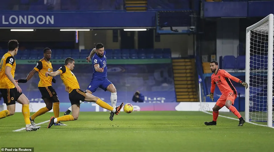 Trung phong Giroud được hậu vệ của Wolverhampton theo kèm rất chặt. Ảnh: Reuters.
