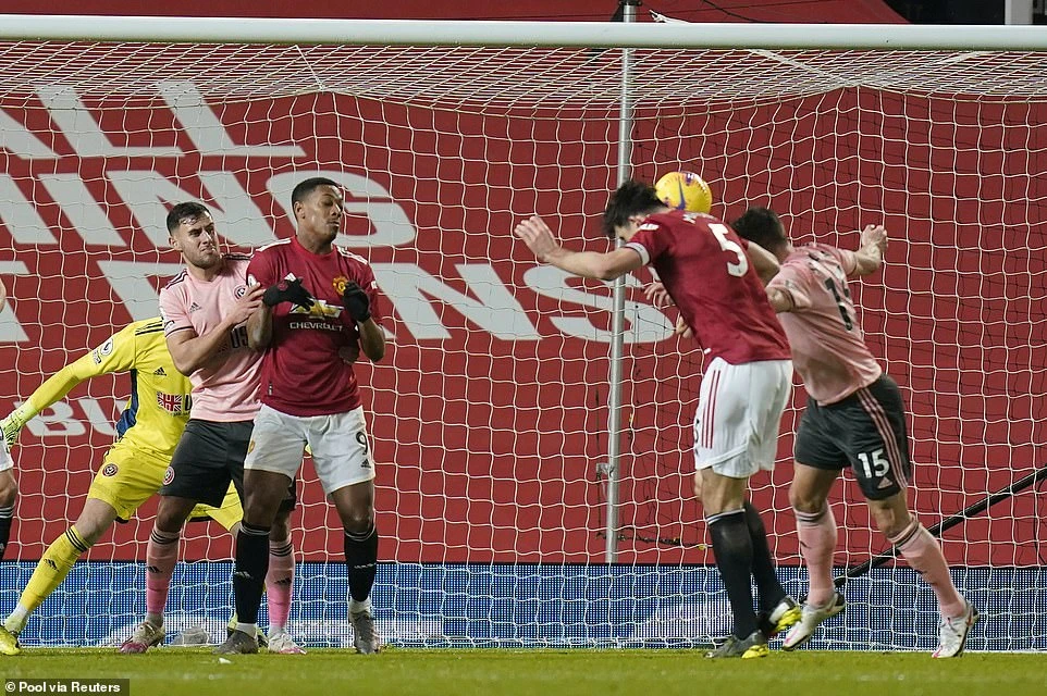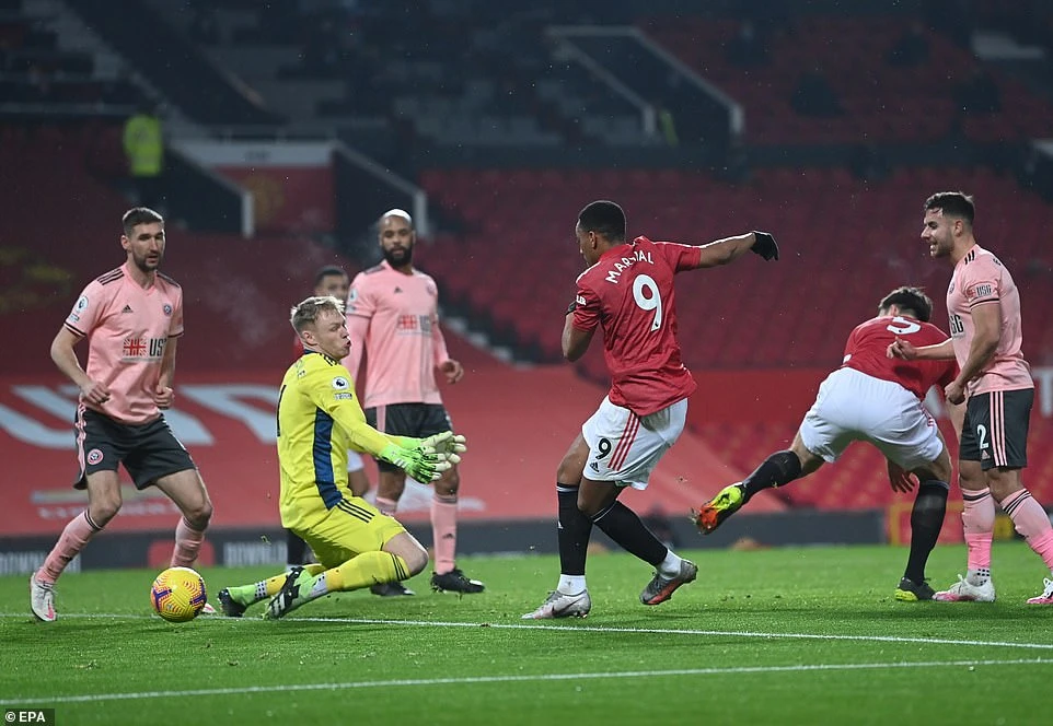 Đến phút 30, Martial tận dụng hàng thủ của Sheffield United lộn xộn sau tình huống phạt góc để ghi bàn, tuy nhiên bàn thắng của tiền đạo người Pháp không được công nhận do trước đó đội trưởng Maguire đã phạm lỗi. Khoảng thời gian còn lại của hiệp một, hàng thủ Sheffield United thi đấu kín kẽ để bảo toàn tỷ số 1-0.