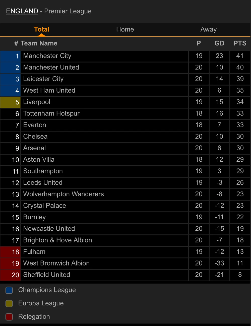 Nhận trận thua cực sốc 1-2 rên sân nhà trước đội bóng chót bảng là Sheffield United, MU đánh mất vị trí đầu bảng vào tay “hàng xóm” Man. City. MU rơi xuống vị trí thứ 2 với 40 điểm sau 20 vòng đấu, trong khi đó Man. City dù đá ít hơn một trận nhưng vẫn hơn MU 1điểm.