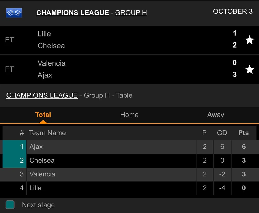 Giành chiến thắng với tỷ số 2-1 đầy khó khăn trên sân Pierre-Mauroy, Chelsea có được vị trí thứ 2 bảng H với 3 điểm. Dù cùng điểm số với Valencia, nhưng đội bóng của HLV Frank Lampard vẫn xếp trên đối thủ nhờ hơn “bầy dơi” về mặt hiệu số.
