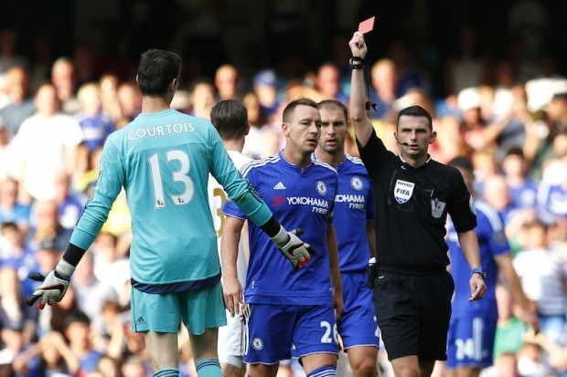 Trọng tài Oliver rút thẻ đỏ Courtois