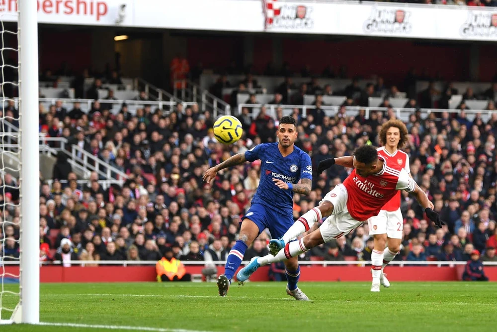 Sức nóng của trận đại chiến giữa Arsenal và Chelsea được đẩy lên đỉnh điểm, khi đội chủ nhà có bàn thắng vươn lên dẫn trước. Phút 13 từ tình huống phạt góc, trung vệ Calum Chambers đánh đầu kiến tạo, cho trung phong Aubameyang chạy chỗ chọn vị trí thuận lợi để đánh đầu cận thành giúp Arsenal vươn lên dẫn trước 1-0.