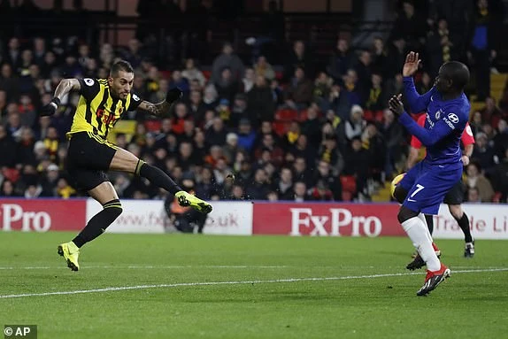 Đội chủ nhà Watford cũng kịp san bằng cách biệt chỉ ít phút sau đó do công của Pereyra. Bắt nguồn từ tình huống đá phạt góc, hậu vệ Chelsea phá bóng không dứt khoát, để cho Pereyra thuận đà băng lên tung cú sút ngoài vòng cấm ghi bàn gỡ hòa 1-1.