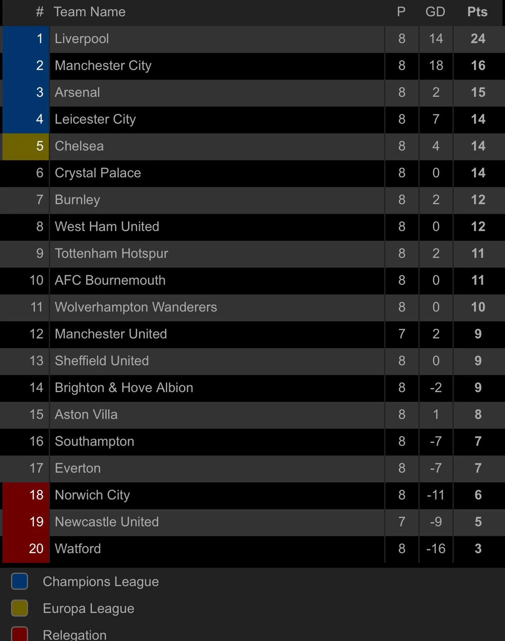 Giành chiến thắng tối thiểu 1-0, Arsenal có được 15 điểm sau 8 vòng đấu. Đội bóng của HLV Unai Emery đứng vị trí thứ 3 trên bảng xếp hạng và tiếp tục “hà hơi” nóng vào nhà ĐKVĐ Man. City đang xếp hạng hai khi chỉ kém “Man xanh” chỉ 1 điểm.
