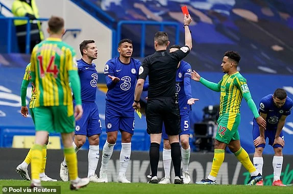 Tuy nhiên, chỉ 2 phút sau, bước ngoặt trận đấu đã xảy ra, trong 1 tình huống không quá nguy hiểm, trung vệ kỳ cựu Thiago Silva lao hai chân đốn ngã cầu thủ West Brom ngay trước vòng cấm. Trọng tài lập tức rút chiếc thẻ vàng thứ hai, đồng nghĩa với thẻ đỏ đuổi Silva khỏi sân.