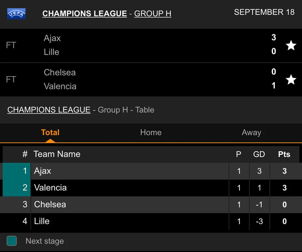 Cặp đấu còn lại của bảng H “ông lớn” của bóng đá Hà Lan là Ajax có chiến thắng tưng bừng trong trận ra quân khi đánh bại đại diện đến từ nước Pháp là Lille với tỷ số 3-0. Qua đó giúp Ajax giành được ngôi đầu bảng H khi có cùng điểm số với Valencia nhưng hơn hiệu số bàn thắng.