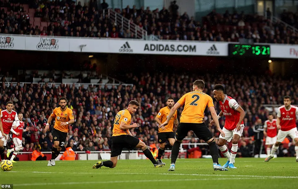 Nếu như Chelsea giành chiến thắng để bảo vệ vị trí trong tốp 4 thì đội bóng khác cùng thủ đô London lại hụt hơi trong cuộc đua này. Vòng 11, Arsenal tiếp Wolverhamton trên sân nhà Emirates. Phút 21, từ đường tham gia tấn công của David Luiz, bóng được trung vệ người Brazil căng ngang vào vòng cấm. Tiền đạo Lacazette đón bóng rồi xoay người kiến tạo cho Aubameyang ghi bàn mở tỉ số.