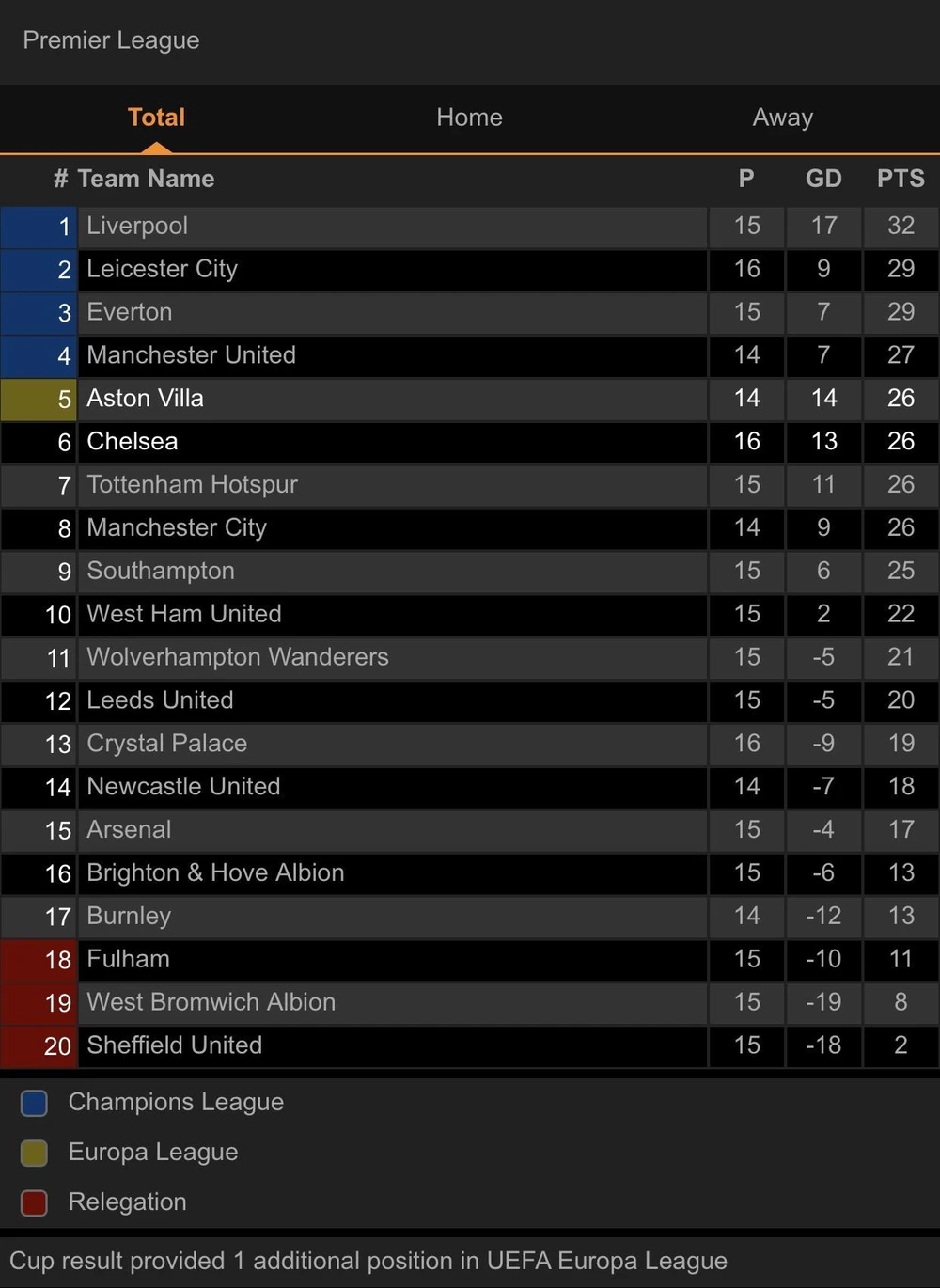 Cả 4 CLB này đều có cùng 26 điểm và chỉ hơn kém nhau về hiệu số bàn thắng bại. Các vị trí trong Top 4 Premier League là Liverpool (32 điểm), Everton (29 điểm), Leicester City (29 điểm) và Manchester United (27 điểm).