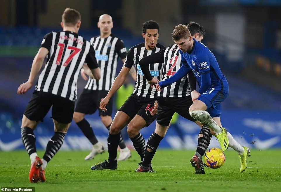 Tám phút sau bàn thắng mở tỷ số, Chelsea nhân đôi cách biệt từ tình huống cố định. Phút 39, từ tình huống phạt góc Giroud bật cao đánh đầu, trong pha bóng này hậu vệ của Newcastle cản phá không tốt để bóng đến chân Werner. Tiền đạo người Đức không bỏ lỡ cơ hội để ghi bàn nâng tỷ số lên 2-0. Với lợi thế dẫn trước hai bàn, Chelsea thoải mái bước vào giờ nghỉ hiệp.