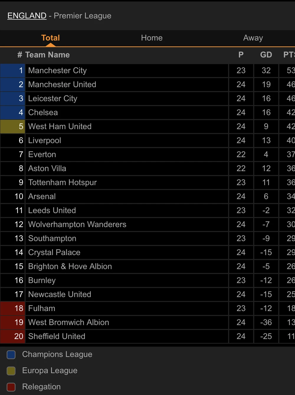 Mặc dù cùng điểm số với thầy trò Tuchel, nhưng do kém hơn hiệu số bàn thắng nên West Ham đành đứng vị trí thứ 5. Với việc để hai đối thủ vượt mặt, Liverpool rơi xuống vị trí thứ 6 trên BXH sau khi vòng 24 Premier League kết thúc.