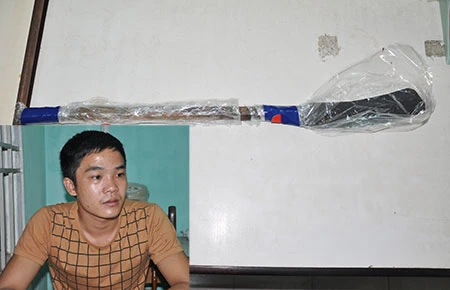 Nguyễn Mai Hoàng Long tại cơ quan công an cùng con dao gây án. Ảnh: KT