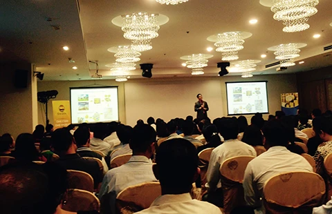 Một người được giới thiệu là “chuyên gia tiền ảo” đang diễn thuyết tại buổi hội thảo về onecoin. Ảnh: YÊN TRANG