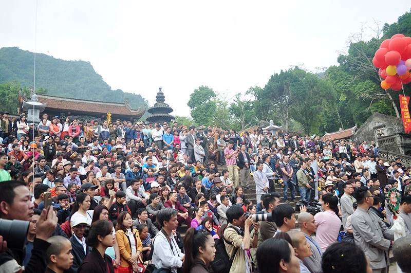 Du khách chen chân xem lễ khai hội Chùa Hương tại khu vực chùa Thiên Trù, Chùa Hương