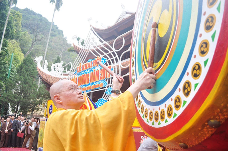 Thượng toạ Thích Minh Hiền, Trụ trì Chùa Hương đánh trống khai hội Chùa Hương 2017