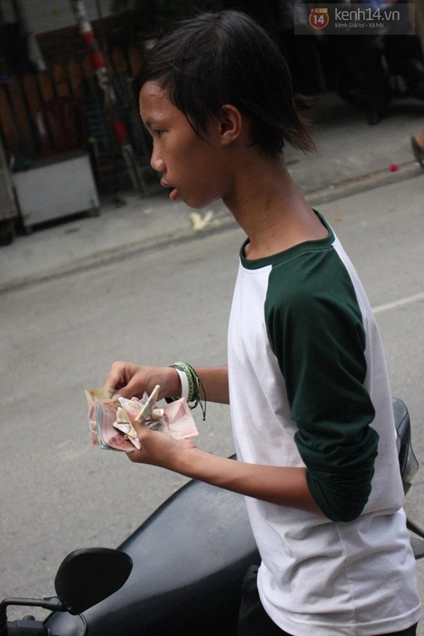 Những cô cậu choai choai, tầm 17 tuổi hoan hỉ sau khi cướp được tiền. Cậu bé này có vẻ mãn nguyện khi kiếm được hơn 100 ngàn đồng sau vài tiếng đồng hồ đợi chờ.