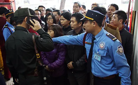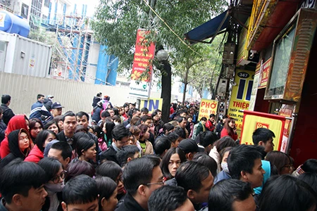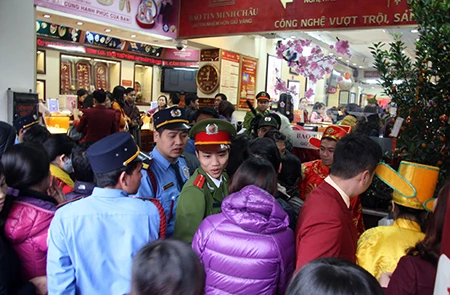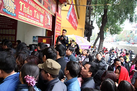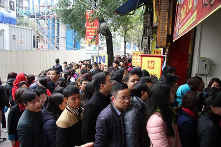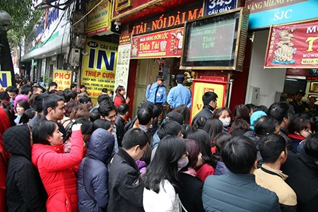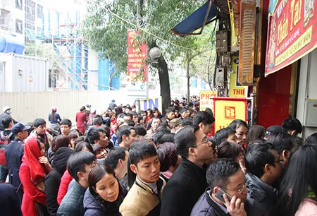 Ngay từ sáng 17-2, hàng nghìn người dân Hà Nội đã tập trung về phố vàng Trần Nhân Tông để xếp hàng mua vàng lấy may. Tính đến hiện tại các cửa hàng như Bảo Tín Minh Châu, Doji, SJC, hàng nghìn người xếp hàng dài cả trăm mét để đợi đến lượt lấy số.